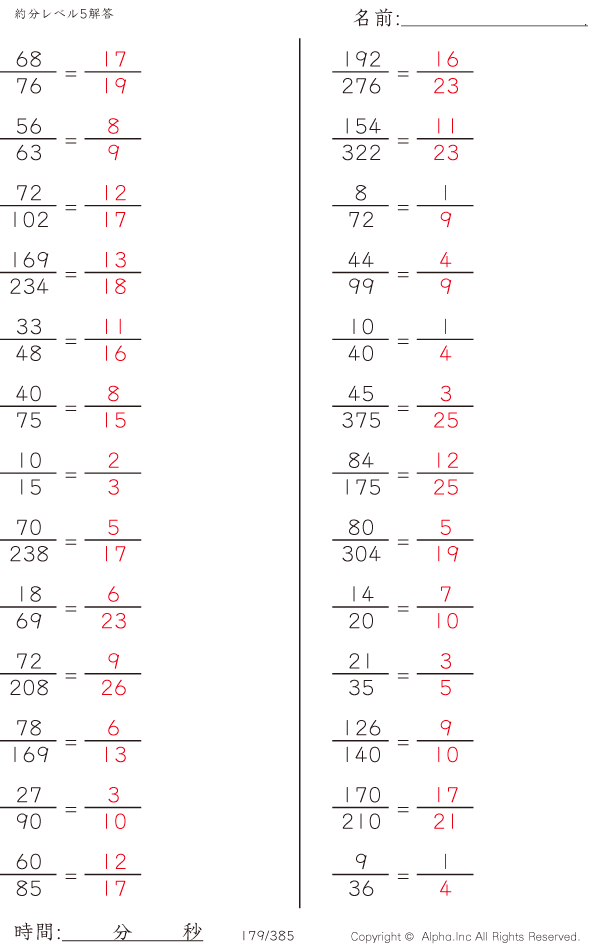 上記のボタンから「約分レベル5」の算数数学ドリル・計算ドリル(PDFプリント)がダウンロードできます。個人利用は無料です(家庭以外での配布は有料です)。