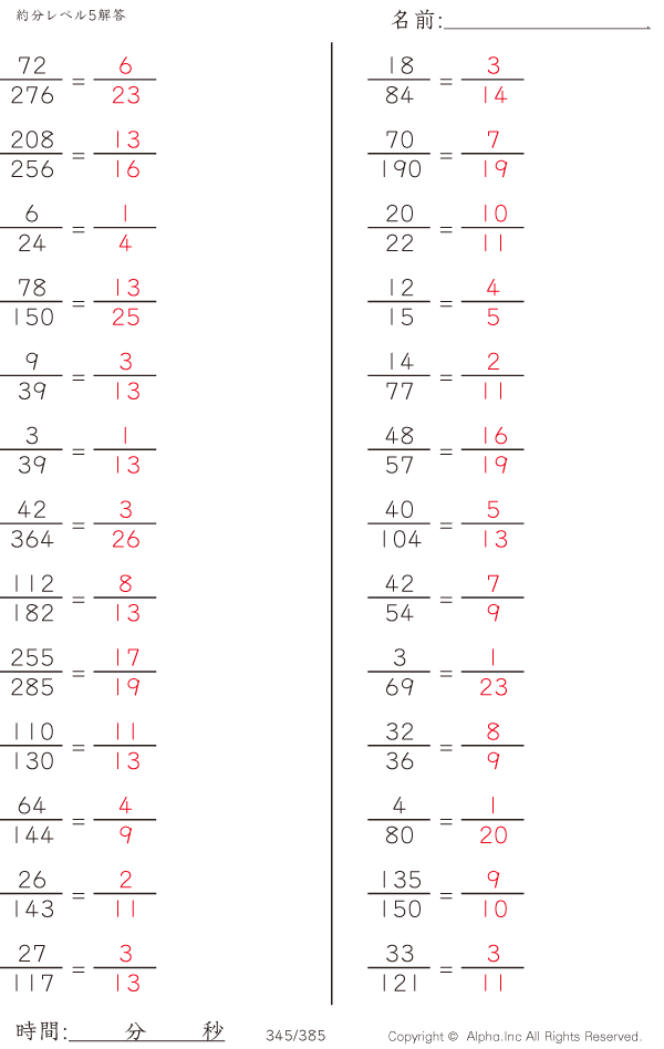 上記のボタンから「約分レベル5」の算数数学ドリル・計算ドリル(PDFプリント)がダウンロードできます。個人利用は無料です(家庭以外での配布は有料です)。