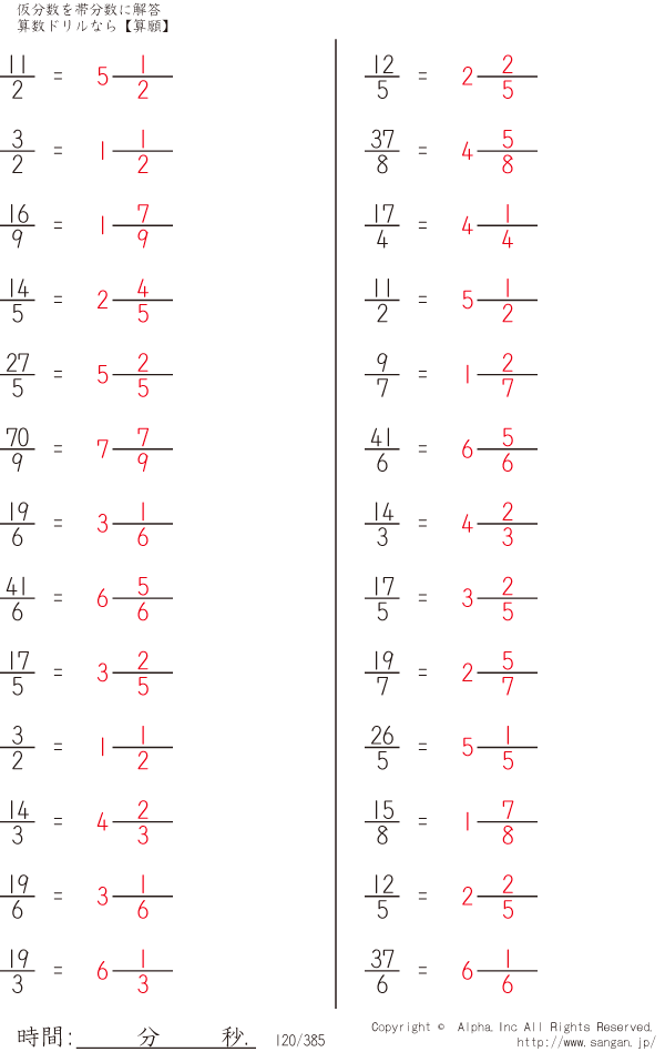 上記のボタンから「仮分数を帯分数に」の算数数学ドリル・計算ドリル(PDFプリント)がダウンロードできます。個人利用は無料です(家庭以外での配布は有料です)。