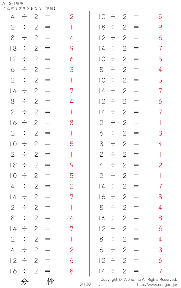 A÷2のPDFプリント あまりなし 割り切れる [解答]005/100