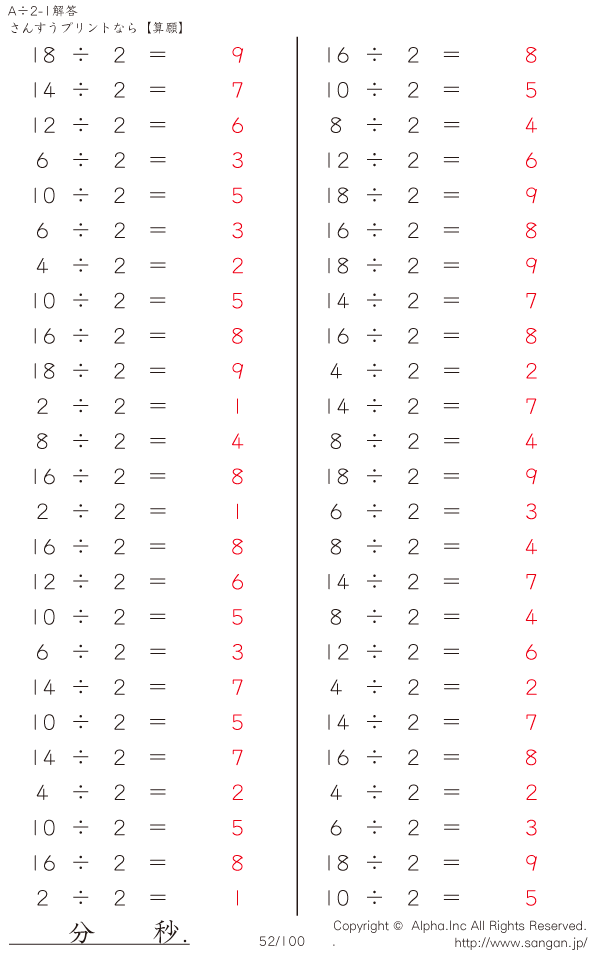 A÷2のPDFプリント あまりなし 割り切れる [解答]052/100