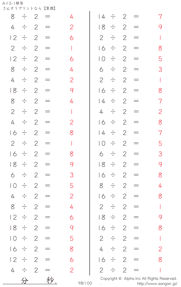 A÷2のPDFプリント あまりなし 割り切れる [解答]098/100