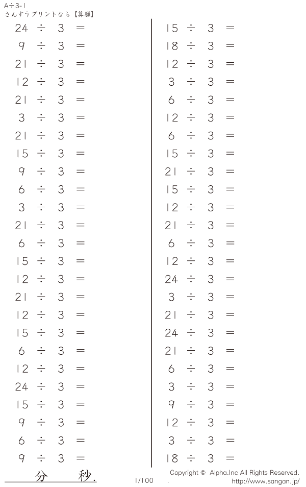 A÷3のPDFプリント あまりなし 割り切れる [問題]001/100