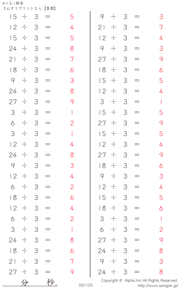 A÷3のPDFプリント あまりなし 割り切れる [解答]035/100