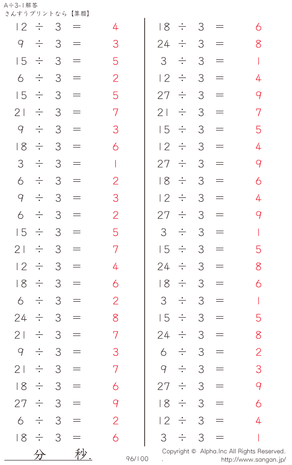 A÷3のPDFプリント あまりなし 割り切れる [解答]096/100