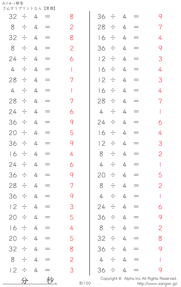 A÷4のPDFプリント あまりなし 割り切れる [解答]008/100