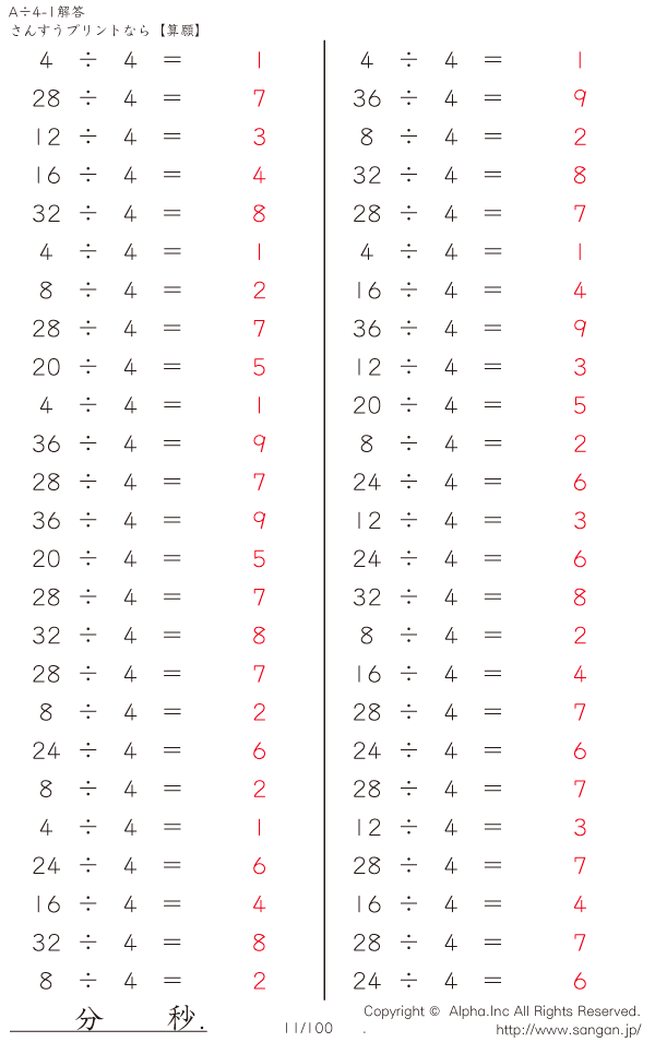 A÷4のPDFプリント あまりなし 割り切れる [解答]011/100