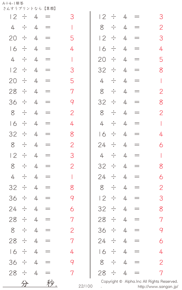 A÷4のPDFプリント あまりなし 割り切れる [解答]022/100
