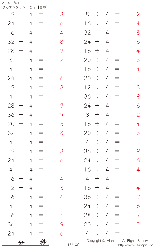 A÷4のPDFプリント あまりなし 割り切れる [解答]045/100
