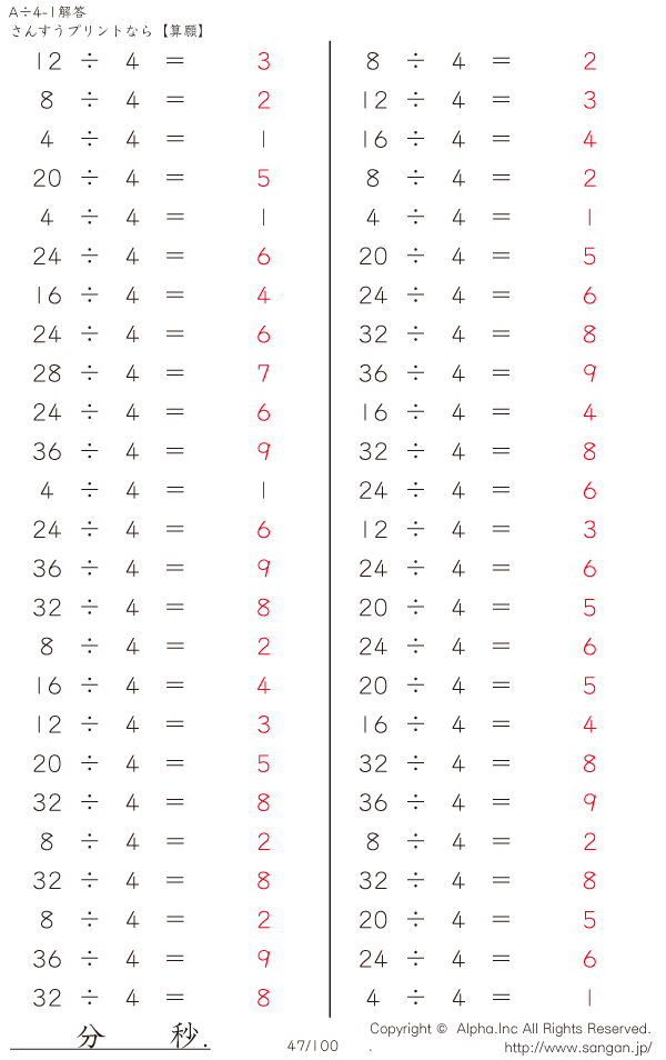 A÷4のPDFプリント あまりなし 割り切れる [解答]047/100
