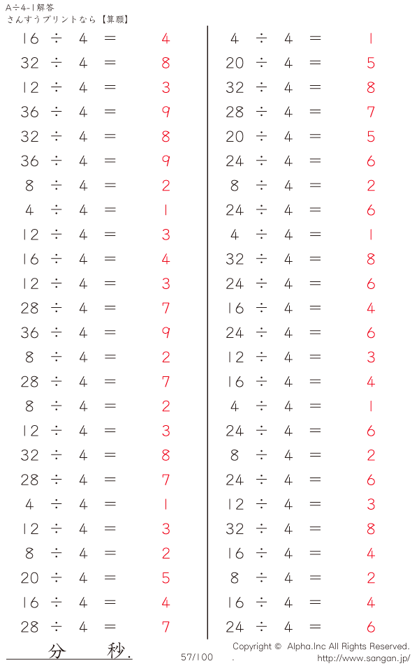 A÷4のPDFプリント あまりなし 割り切れる [解答]057/100