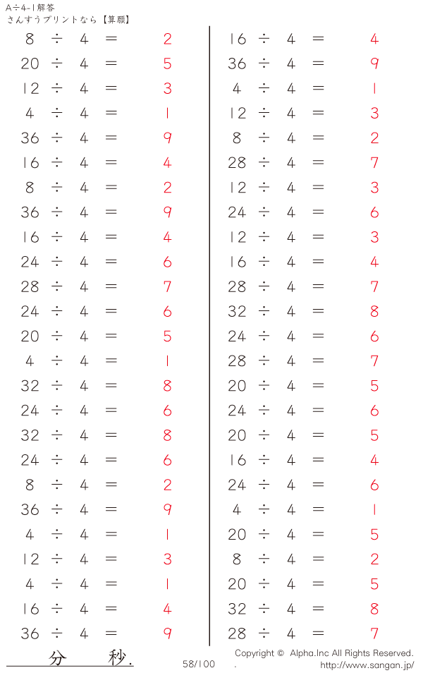 A÷4のPDFプリント あまりなし 割り切れる [解答]058/100