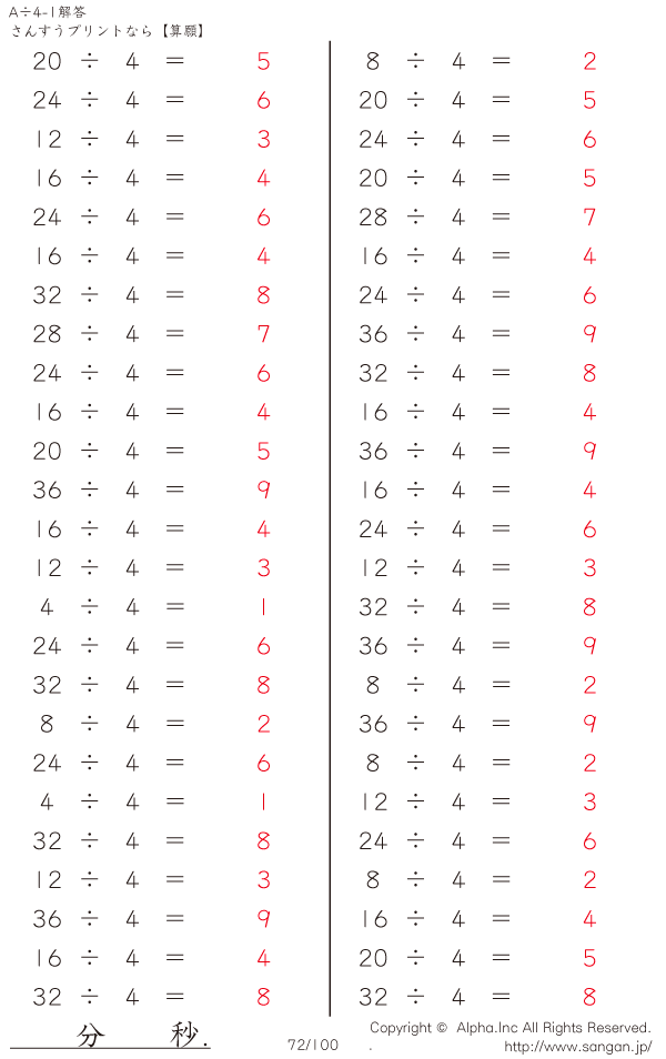 A÷4のPDFプリント あまりなし 割り切れる [解答]072/100