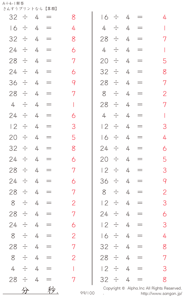 A÷4のPDFプリント あまりなし 割り切れる [解答]099/100