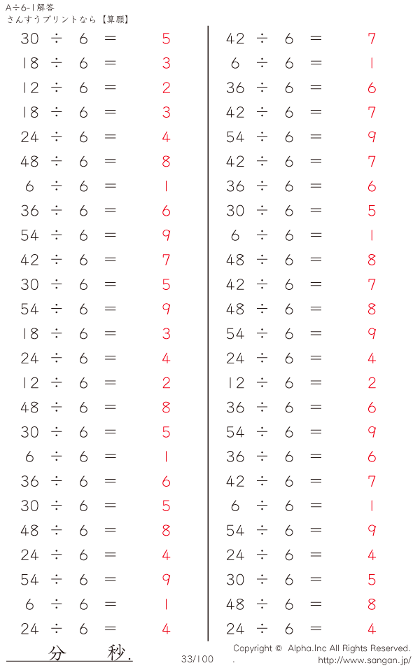 A÷6のPDFプリント あまりなし 割り切れる [解答]033/100