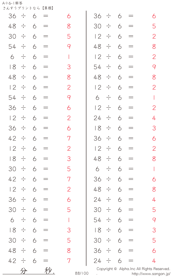 A÷6のPDFプリント あまりなし 割り切れる [解答]088/100
