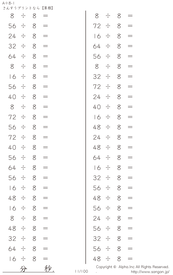A÷8のPDFプリント あまりなし 割り切れる [問題]011/100