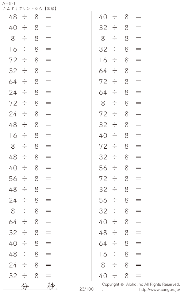 A÷8のPDFプリント あまりなし 割り切れる [問題]023/100