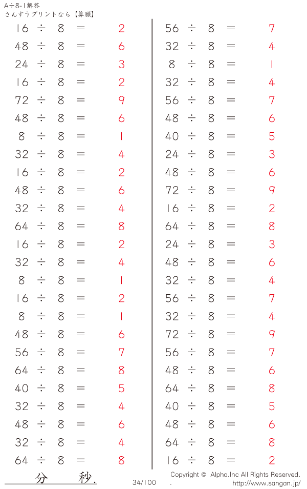 A÷8のPDFプリント あまりなし 割り切れる [解答]034/100