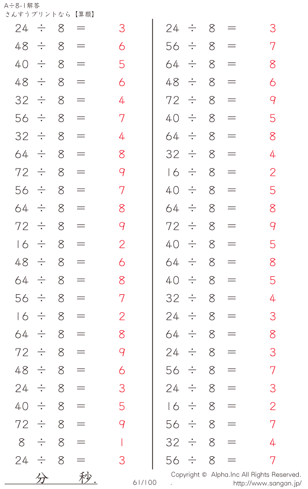 A÷8のPDFプリント あまりなし 割り切れる [解答]061/100