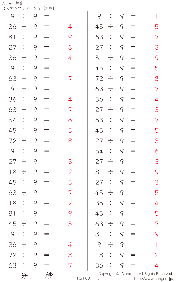 A÷9のPDFプリント あまりなし 割り切れる [解答]010/100