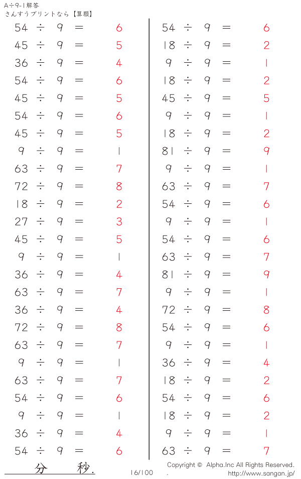 A÷9のPDFプリント あまりなし 割り切れる [解答]016/100