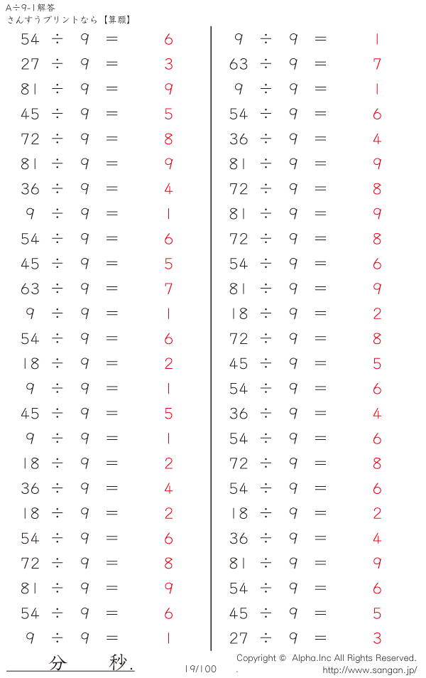 A÷9のPDFプリント あまりなし 割り切れる [解答]019/100