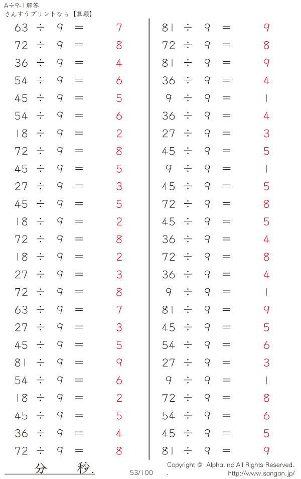 A÷9のPDFプリント あまりなし 割り切れる [解答]053/100