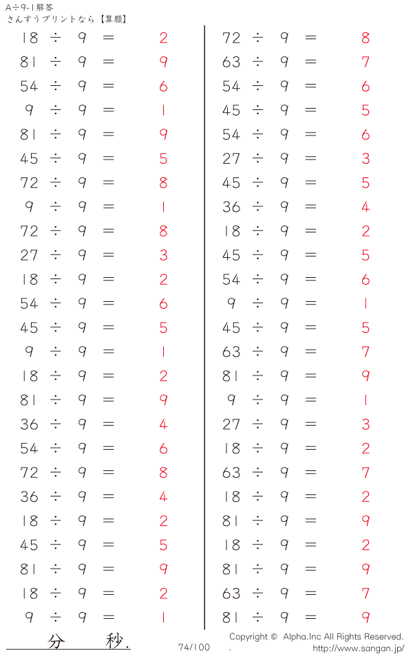 A÷9のPDFプリント あまりなし 割り切れる [解答]074/100