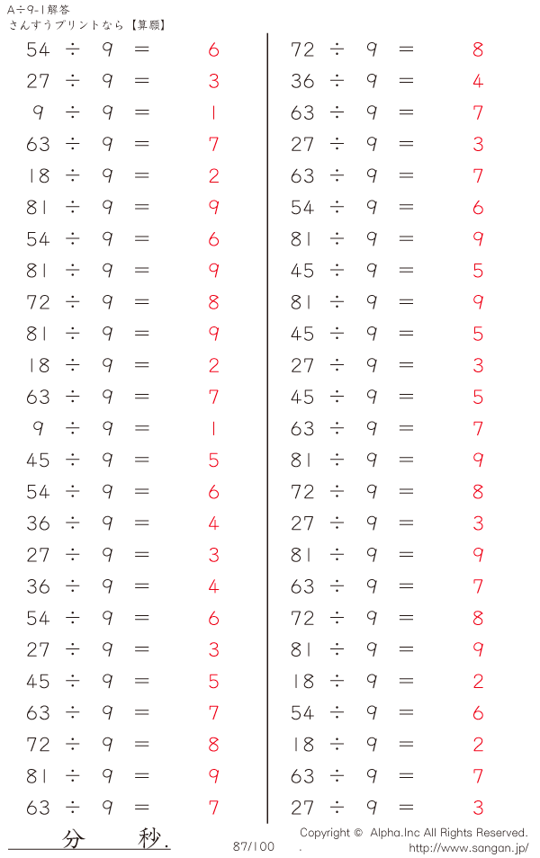A÷9のPDFプリント あまりなし 割り切れる [解答]087/100