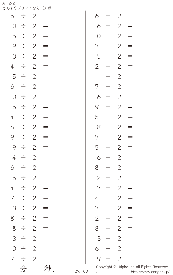 A÷2のPDFプリント あまりあり 割り切れない [問題]027/100
