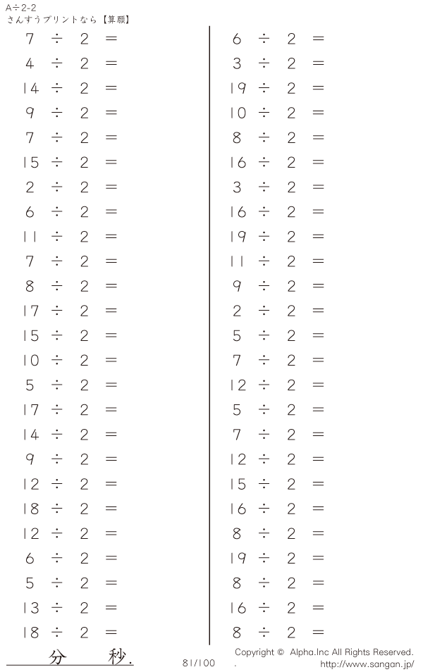 A÷2のPDFプリント あまりあり 割り切れない [問題]081/100