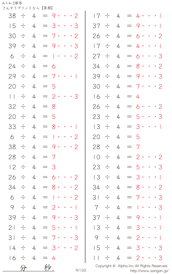 A÷4のPDFプリント あまりあり 割り切れない [解答]009/100