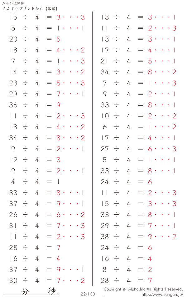 A÷4のPDFプリント あまりあり 割り切れない [解答]022/100