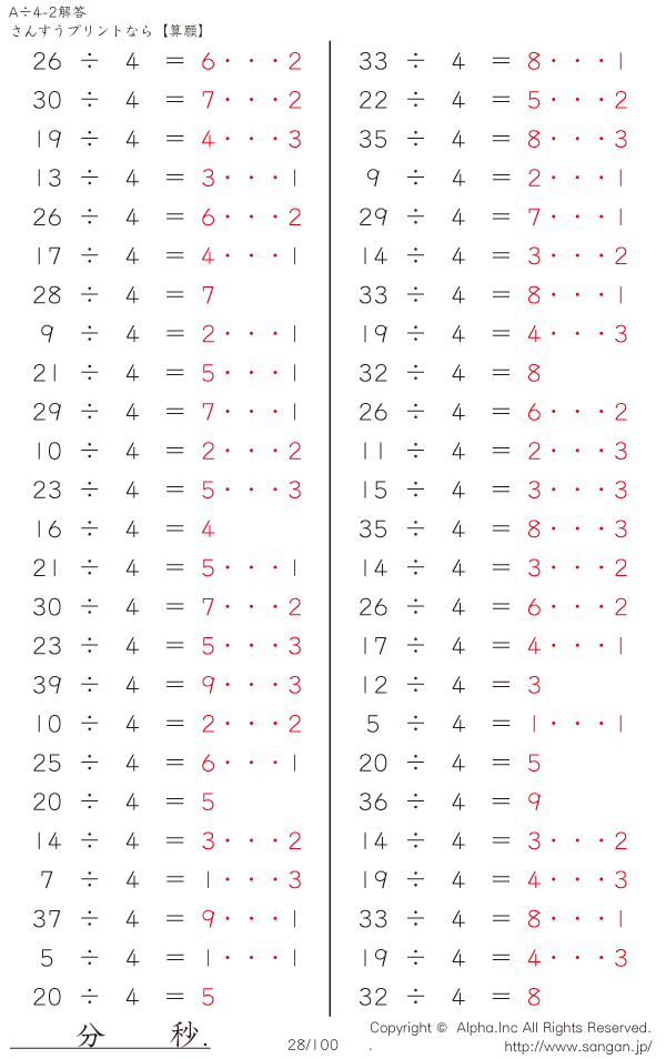 A÷4のPDFプリント あまりあり 割り切れない [解答]028/100