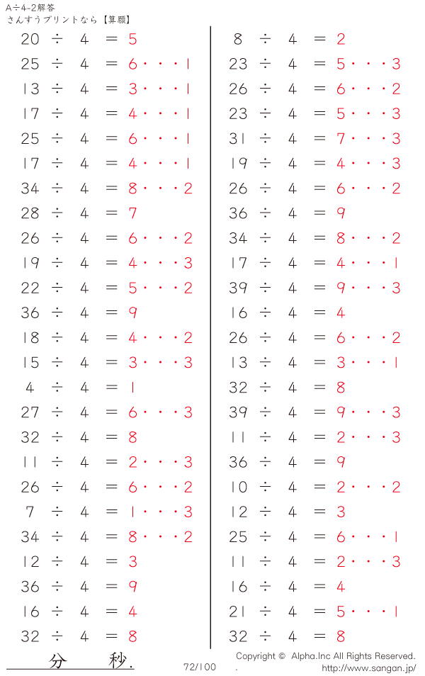 A÷4のPDFプリント あまりあり 割り切れない [解答]072/100