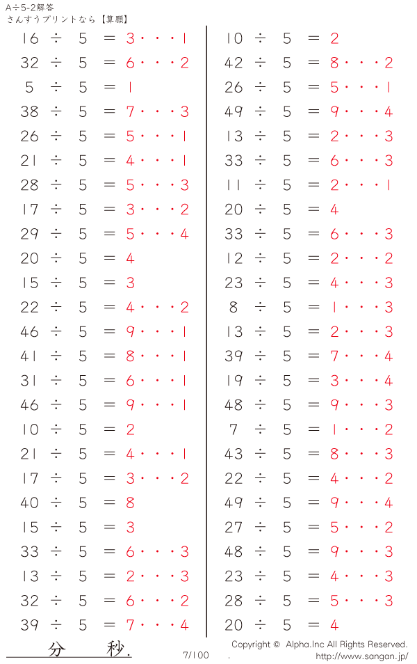 A÷5のPDFプリント あまりあり 割り切れない [解答]007/100