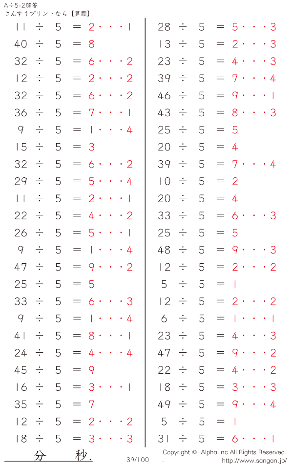 A÷5のPDFプリント あまりあり 割り切れない [解答]039/100