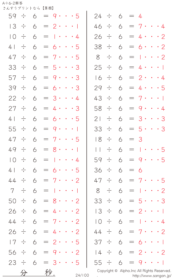 A÷6のPDFプリント あまりあり 割り切れない [解答]024/100