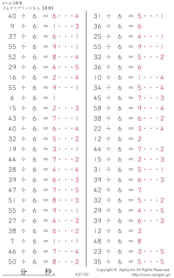 A÷6のPDFプリント あまりあり 割り切れない [解答]043/100
