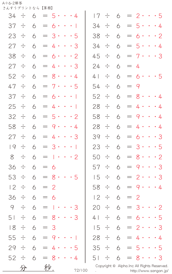 A÷6のPDFプリント あまりあり 割り切れない [解答]072/100