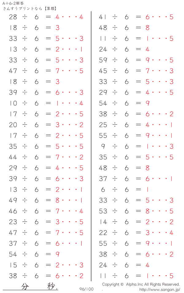 A÷6のPDFプリント あまりあり 割り切れない [解答]096/100