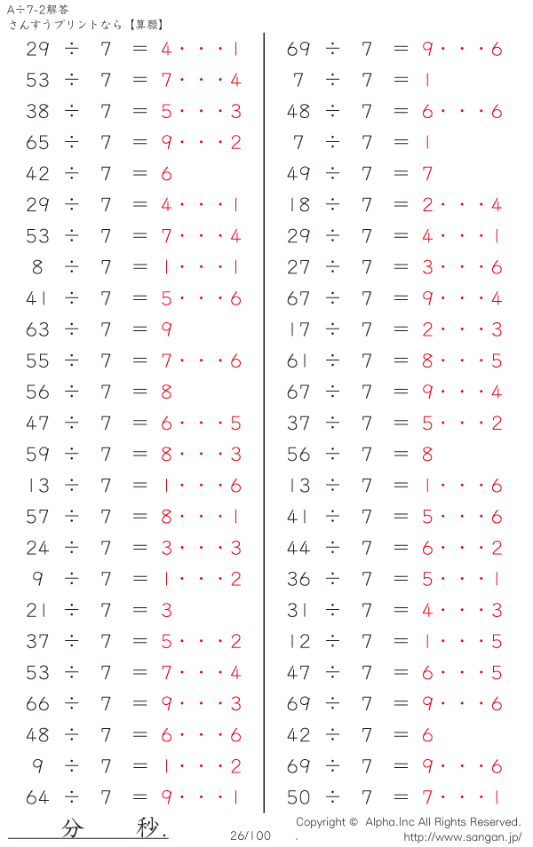 A÷7のPDFプリント あまりあり 割り切れない [解答]026/100