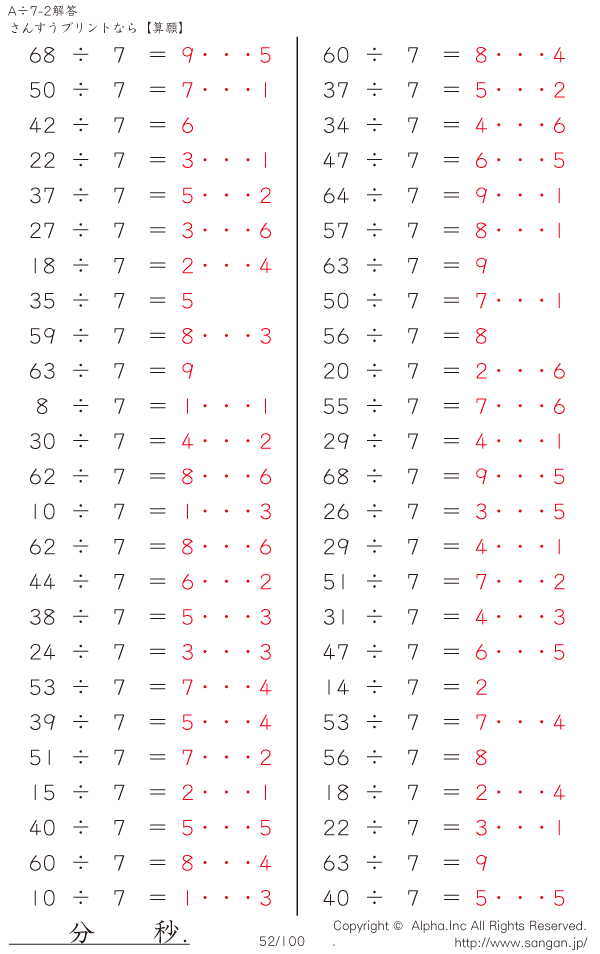A÷7のPDFプリント あまりあり 割り切れない [解答]052/100