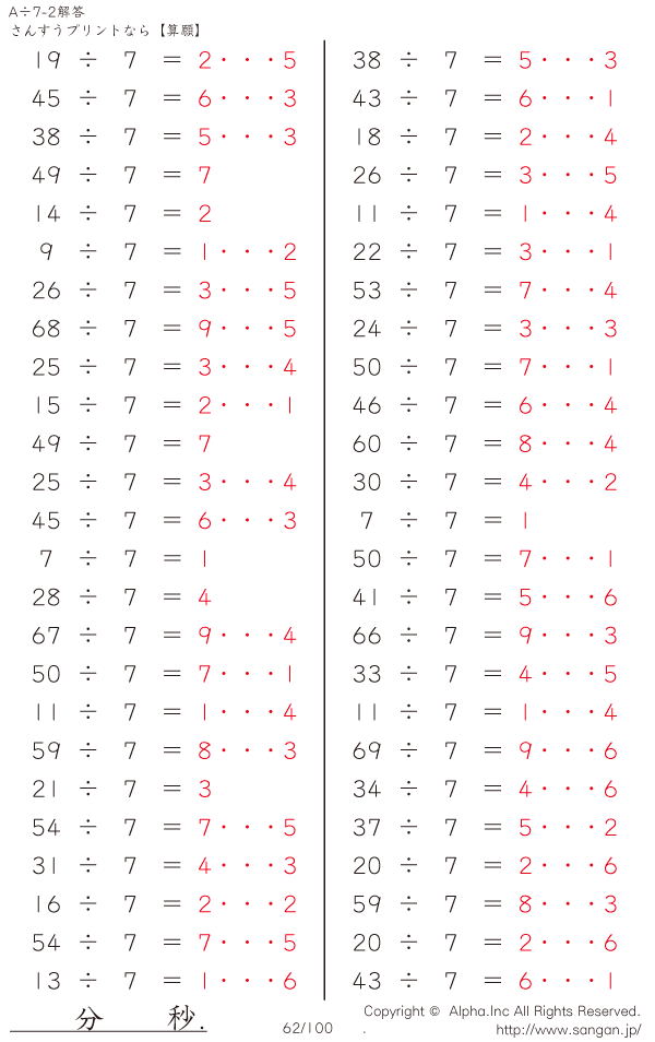 A÷7のPDFプリント あまりあり 割り切れない [解答]062/100