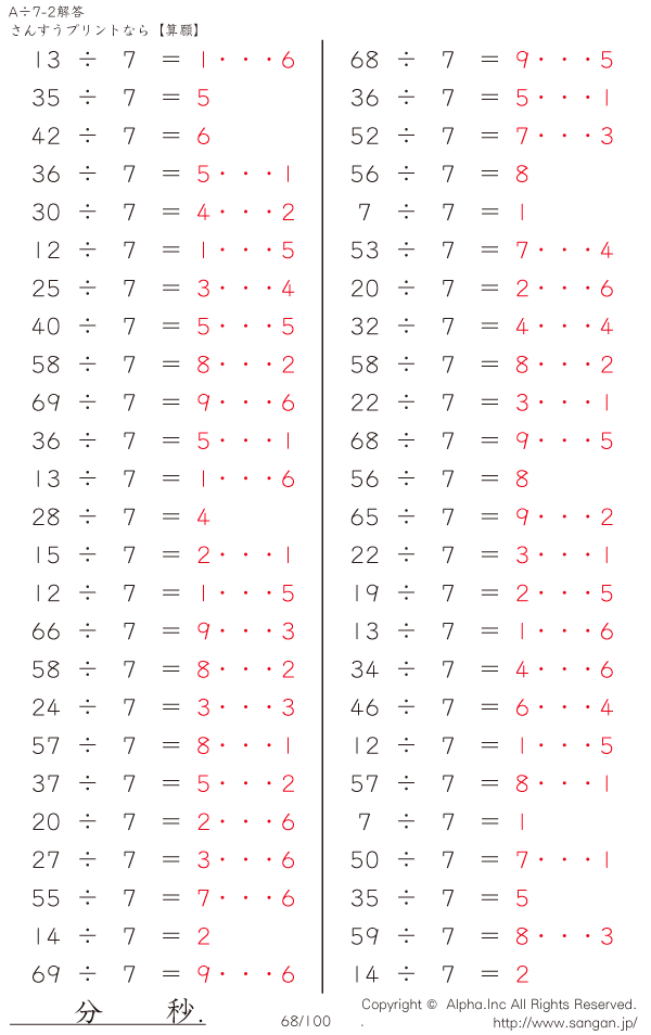 A÷7のPDFプリント あまりあり 割り切れない [解答]068/100
