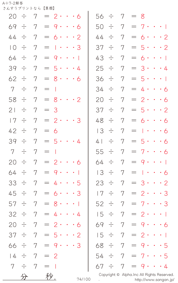 A÷7のPDFプリント あまりあり 割り切れない [解答]074/100