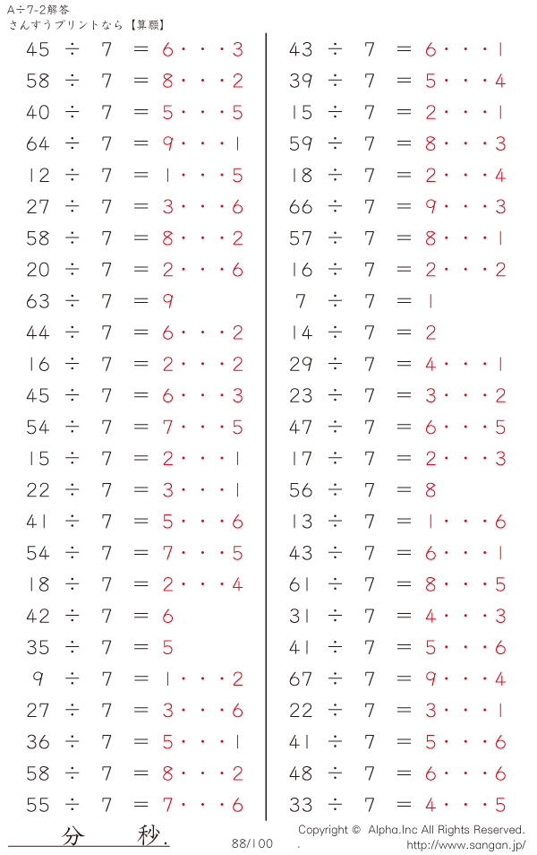 A÷7のPDFプリント あまりあり 割り切れない [解答]088/100