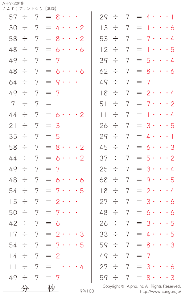A÷7のPDFプリント あまりあり 割り切れない [解答]099/100