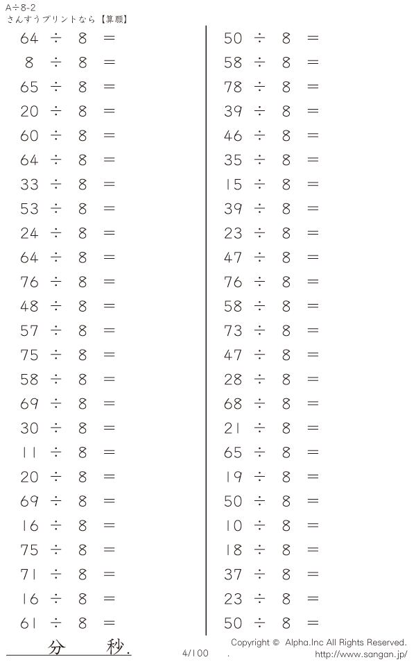 A÷8のPDFプリント あまりあり 割り切れない [問題]004/100